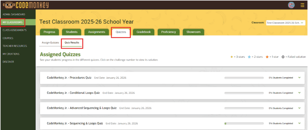 To access this tool, go to any CodeMonkey Classroom, select the Quizzes tab, and assign a CodeMonkey Jr. quiz to those students: